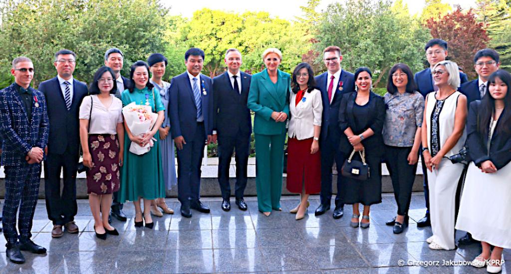 Prezydent Andrzej Duda podczas uroczystości w Ambasadzie RP w Pekinie wręczył odznaczenia osobom zasłużonym dla rozwoju współpracy bilateralnej. W spotkaniu wzięła udział Małżonka Prezydenta Agata Kornhauser–Duda.